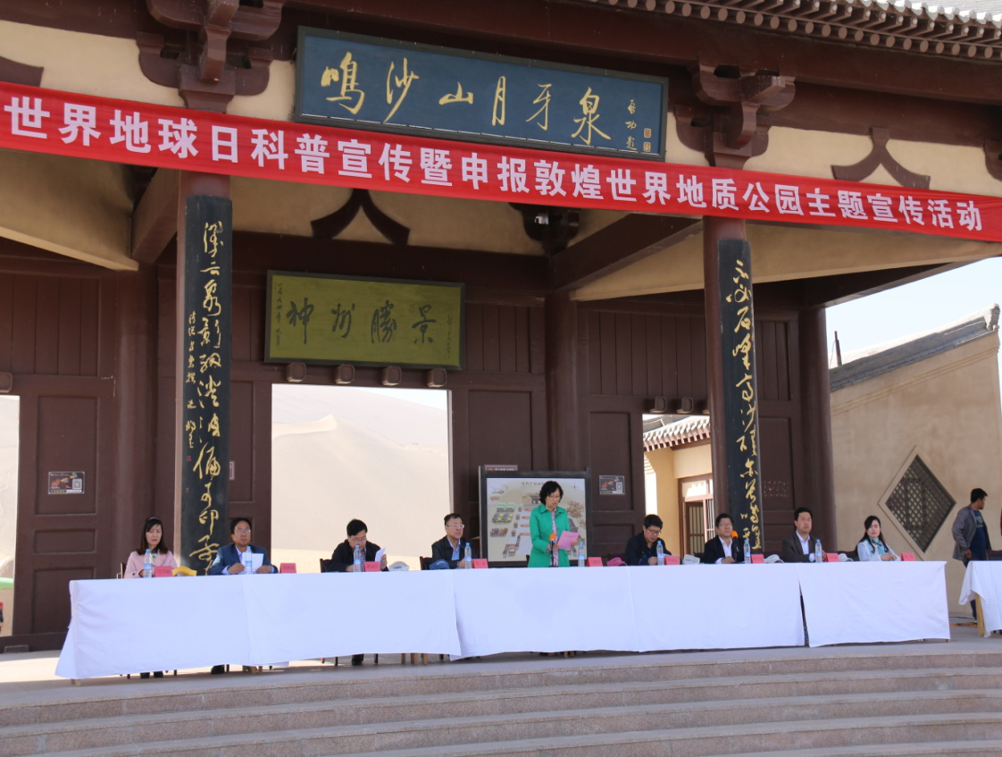4月25日早9点,在月牙泉山门广场,敦煌市第46个世界地球日科普宣传暨申报敦煌世界地质公园主题宣传活动隆重举行。