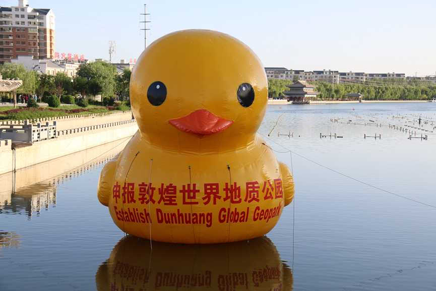6月20日,由敦煌世界地质公园申报办设计定做的大黄鸭来到了敦煌党河风情线,助力敦煌申报世界地质公园,受到了广大市民群众的一致好评。敦煌掀起了一股“大黄鸭”热潮,据悉,它将成为我市申报世界地质公园宣传工作的一大亮点工程。